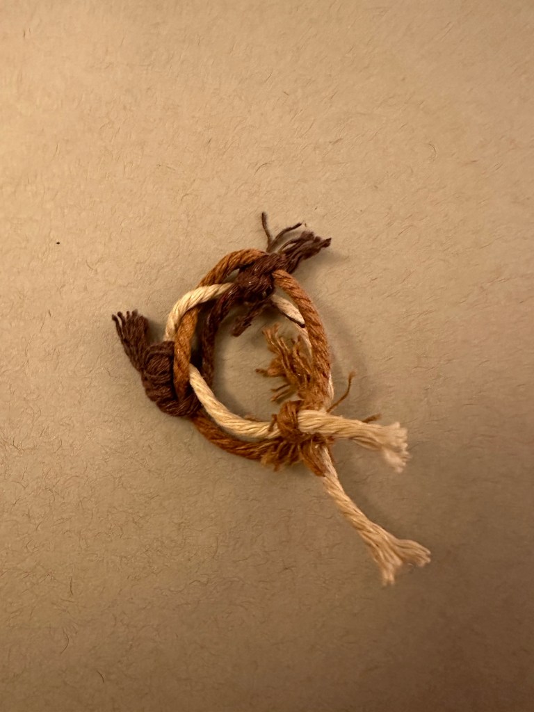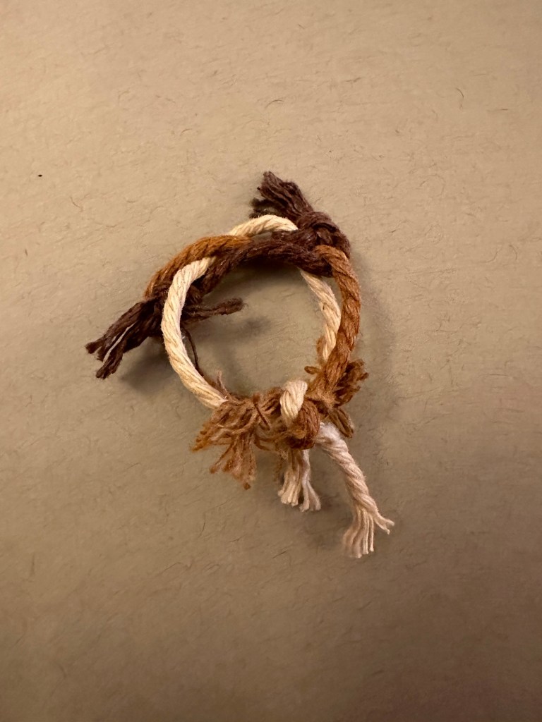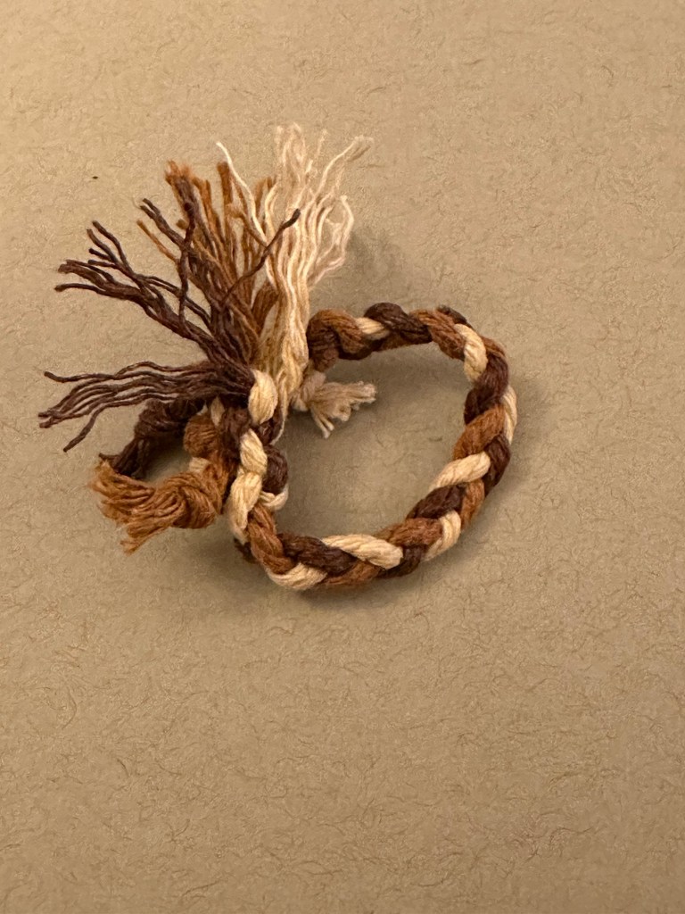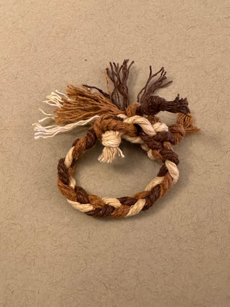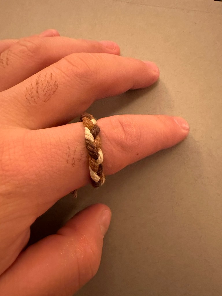 Ring 1: This ring is also a surjective submersion with Euler number 6. This ring is also slightly size changing, and adjusts where the braids meet, or end. To boot, it has a pulley system, with a stop at the end of as many ends as possible and frayed, gravitationally distributed, floral ends out of the pulley strings without stops. This one also features a typical 3 string braid, for aesthetic, patterning purposes. The stops are also nodes at the end of an edge in the graph that makes up the knot.