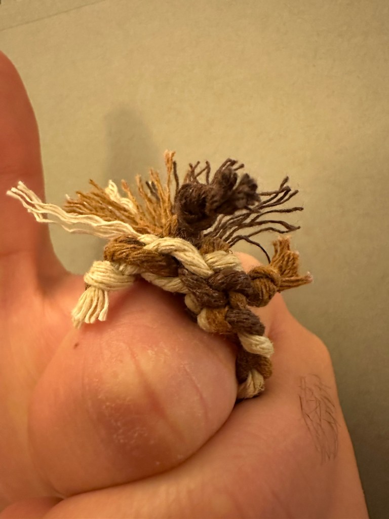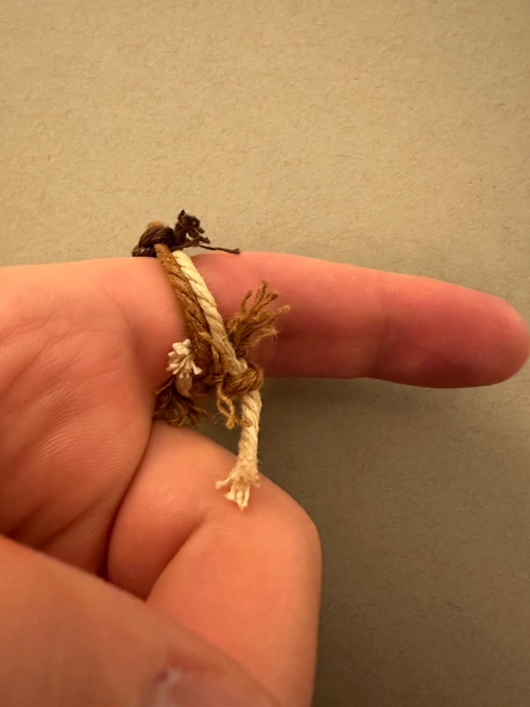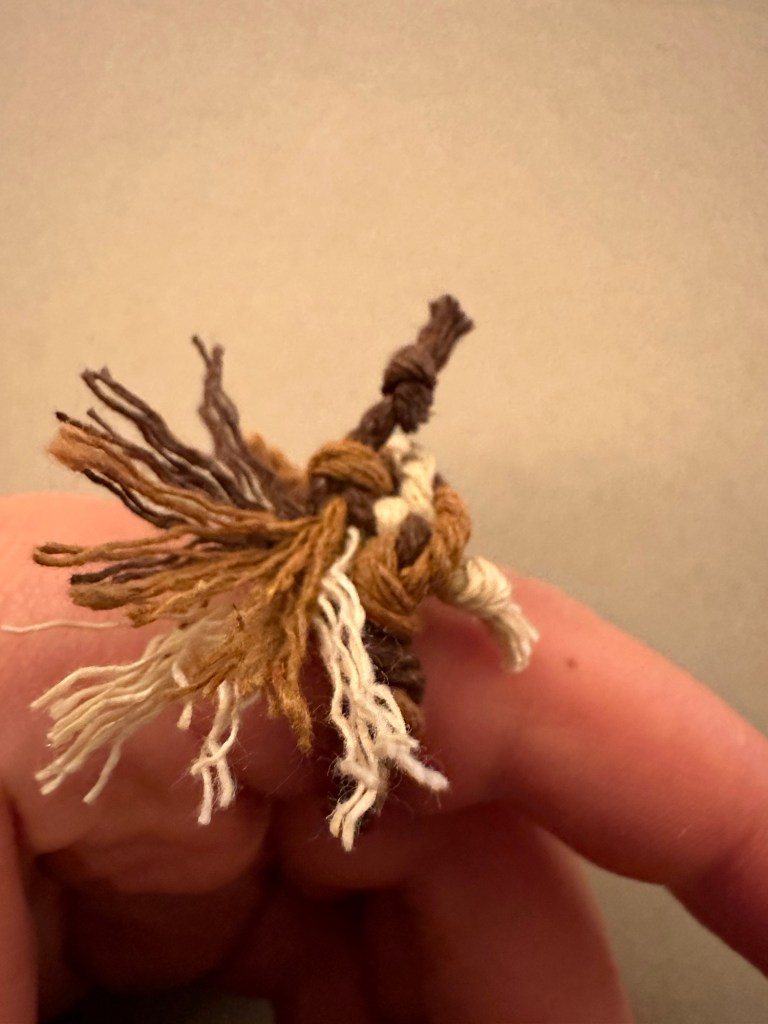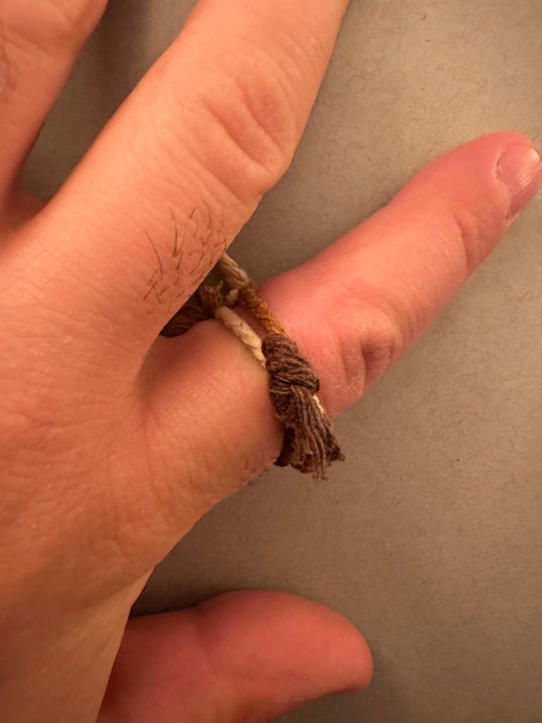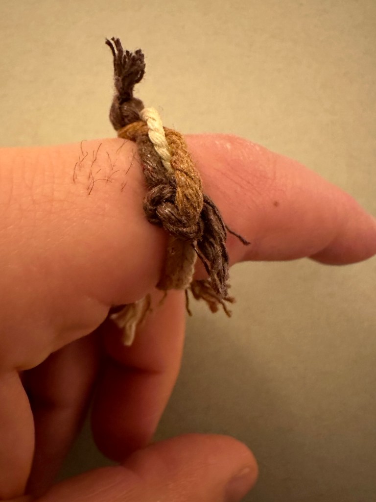Ring 1: This ring is also a surjective submersion with Euler number 6. This ring is also slightly size changing, and adjusts where the braids meet, or end. To boot, it has a pulley system, with a stop at the end of as many ends as possible and frayed, gravitationally distributed, floral ends out of the pulley strings without stops. This one also features a typical 3 string braid, for aesthetic, patterning purposes. The stops are also nodes at the end of an edge in the graph that makes up the knot.